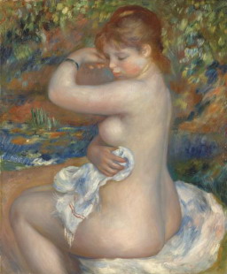 《沐浴者》,创作于1888年,这一年,正值雷诺阿多产创作和声望凸显的时刻,是他艺术生涯的一个关键期。当时,他正在进行女性裸体主题创作,经常以如这幅画类似的一个沐浴者的形式进行构图,画中充满了日益高涨的自信和激情。直到四十岁时,雷诺阿的裸体画作还相当少,在19世纪80年代之前,仅有零星几幅。《沐浴者》认可了经典的传统――描绘了一个与爱神维纳斯雕像(卢浮宫的一件重要的残缺古希腊雕像)有着很相似姿势的女子,但同时,他像莫奈一样,又在画中融入了明显的现实感。1888年,该作品与出自和雷诺阿同道的印象派画家古斯塔夫・卡耶博特、卡米尔・毕沙罗和阿尔弗雷德・西斯莱,以及詹姆斯・阿博特・麦克尼尔・惠斯勒的作品,一同在雷诺阿的代理商保罗・杜兰德・鲁埃尔名下的画廊进行展出。自此之后,雷诺阿对女性裸体的探索创作对一系列的艺术家都产生了深厚的影响,尤其是他那将美融入表现力的创作手法,诞生出诸多表达了对一种近乎永恒的美感的实质化颂扬的诸如当前拍品的画作。这种永恒之美,通过画面中,除了毛巾(和女子手腕上的皮筋,故意缺少的道具,有力地凸显出来。