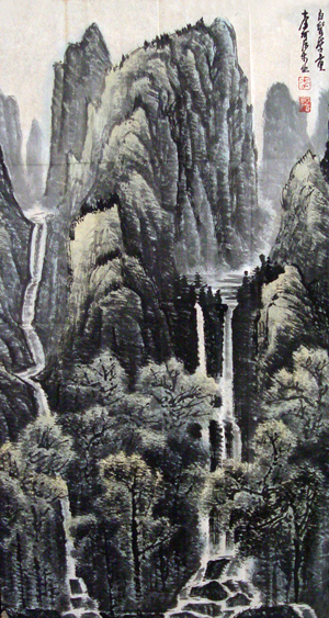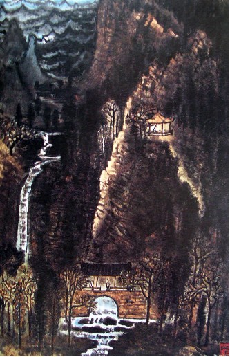 李可染有扎实的素描功底,他的作品让人感受到了屹立千年的中国山水。一种范宽式的饱满构图,山势迎面而来,瀑布浓缩为一条白色的裂隙,用沉涩的笔调一寸一寸地刻画出来,绵绵密密地深入到画面的每一个角落,在一张纸上,表现出最大最丰富的内容。李可染的水墨画一扫逸笔优雅的文人积习,尤其是那以悲沉的黑色形成的基本色调,深深地抓住了人们的视觉。而在这悲怆旋律的制约下,画中即使偶有淡淡的幽雅,也会被这“黑色世界”造成的凄迷的基调所吸引。